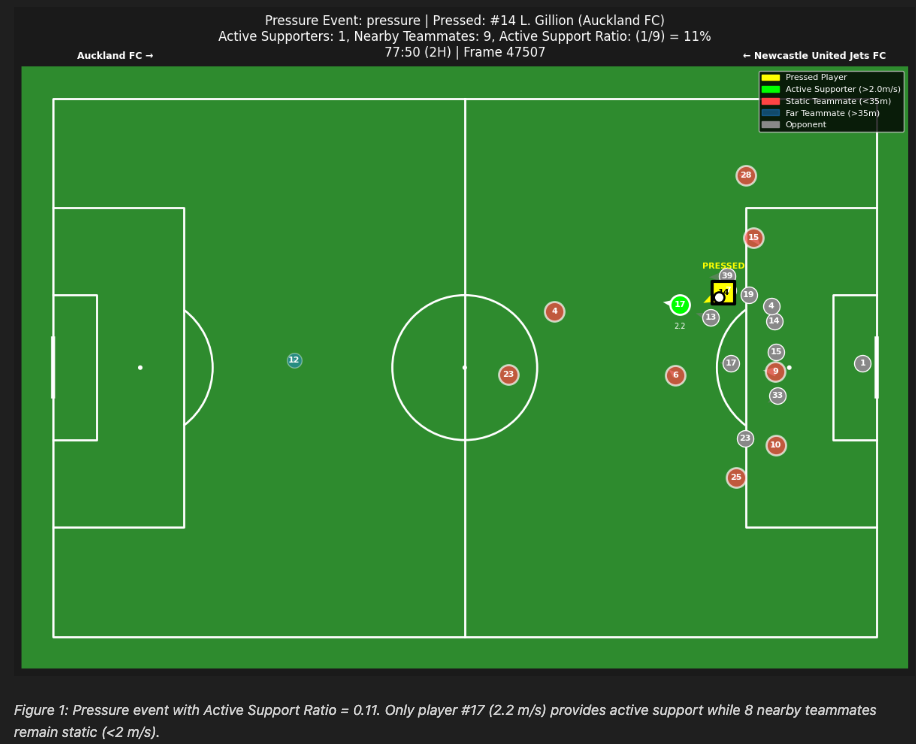 Figure 1 shows a pressure event with low Active Support Ratio where only 1 of 9 nearby teammates (11%) was actively moving—8 teammates were static.
