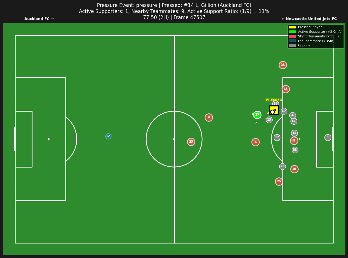 | Per Event | Active Support Ratio | \(\frac{\text{Active Supporters}}{\text{Nearby Teammates}}\) | Support quality in a single pressure moment |