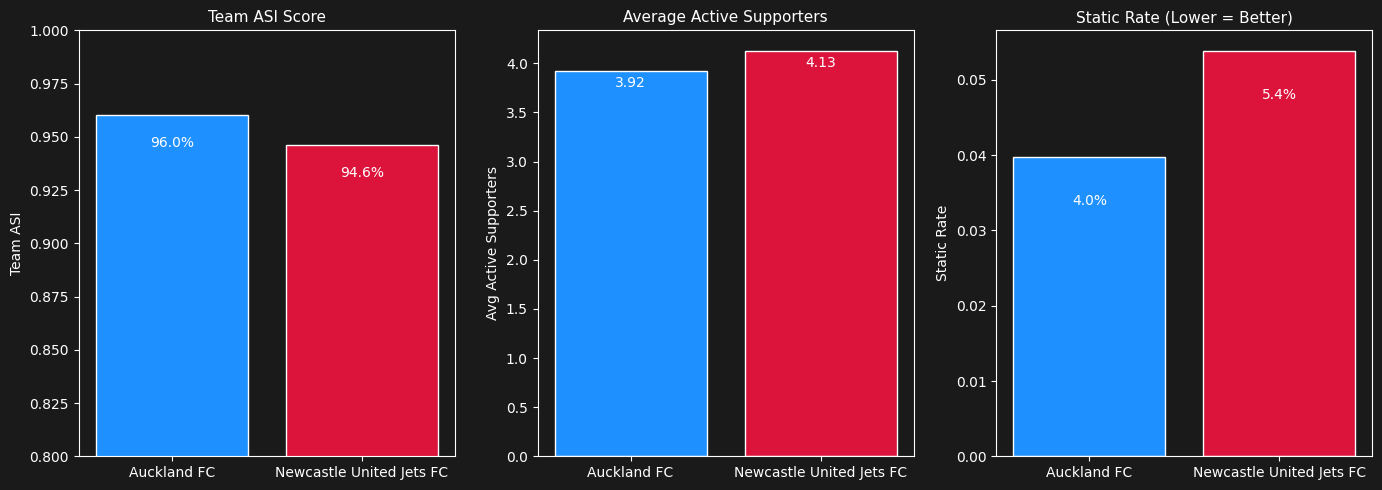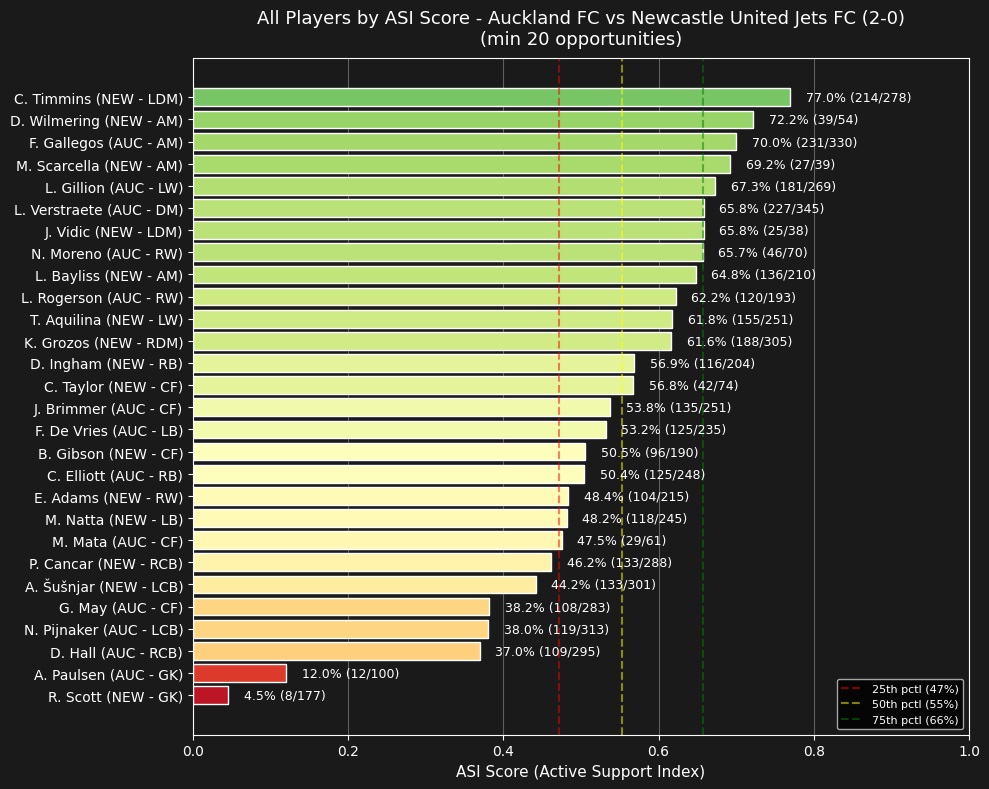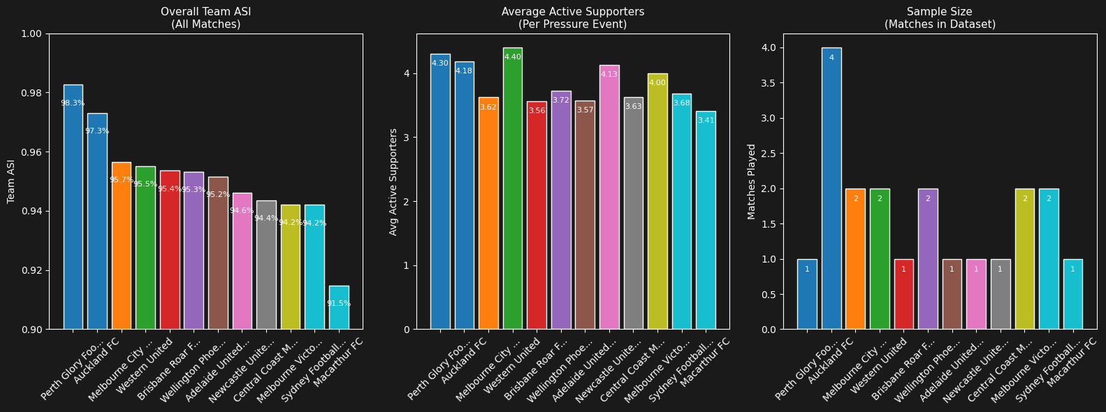 Validation highlights: - ASI correlates with season-level physical output (r = 0.74, p < 0.001) - ASI aligns with positional demands (midfielders 59% vs defenders 45%, p < 0.001) - Team ASI differentiates playing styles (98.3% Perth Glory to 91.5% Macarthur FC) - 58% of players show declining support in H2 (fatigue signal)