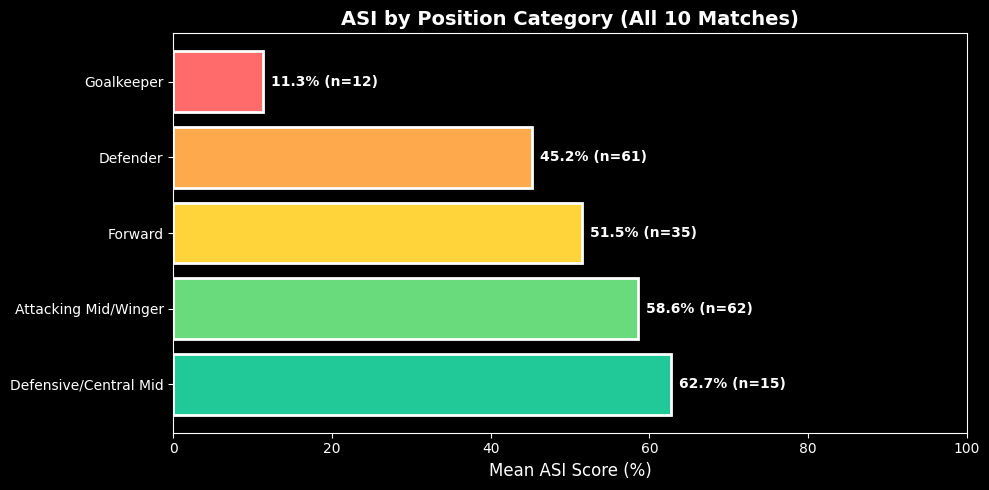 Validation Result: Position categories rank as expected — attacking midfielders and wingers show significantly higher ASI than defenders (p < 0.001). This confirms ASI captures positional movement demands rather than random variation.
