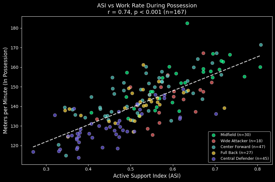 Result: ASI correlates strongly with meters per minute during possession (r = 0.74, p < 0.001). Players in the top ASI quartile cover 24 m/min more than the bottom quartile — a 19% increase in work rate. This external validation confirms ASI captures genuine physical effort: players who actively support teammates under pressure are the same players who cover the most ground when their team has possession.