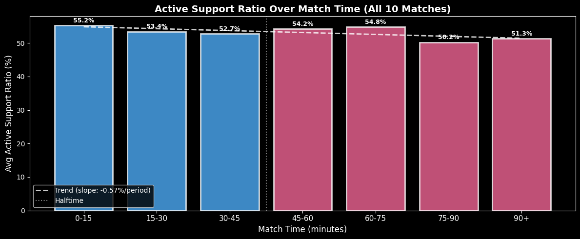 Observation: Active support ratio shows a slight downward trend within each half, with the lowest values appearing in the final 15 minutes (50.2%). However, the overall first half vs second half difference is not statistically significant (p = 0.46). This suggests fatigue-related decline in off-ball support may exist but requires larger sample sizes to confirm. The pattern warrants further investigation with more match data.
