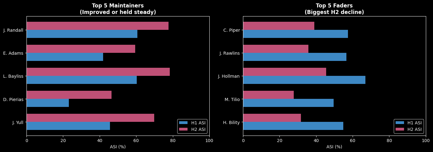 Which players maintain their off-ball support throughout the match vs those who fade? We compare each player’s ASI in the first half vs second half.