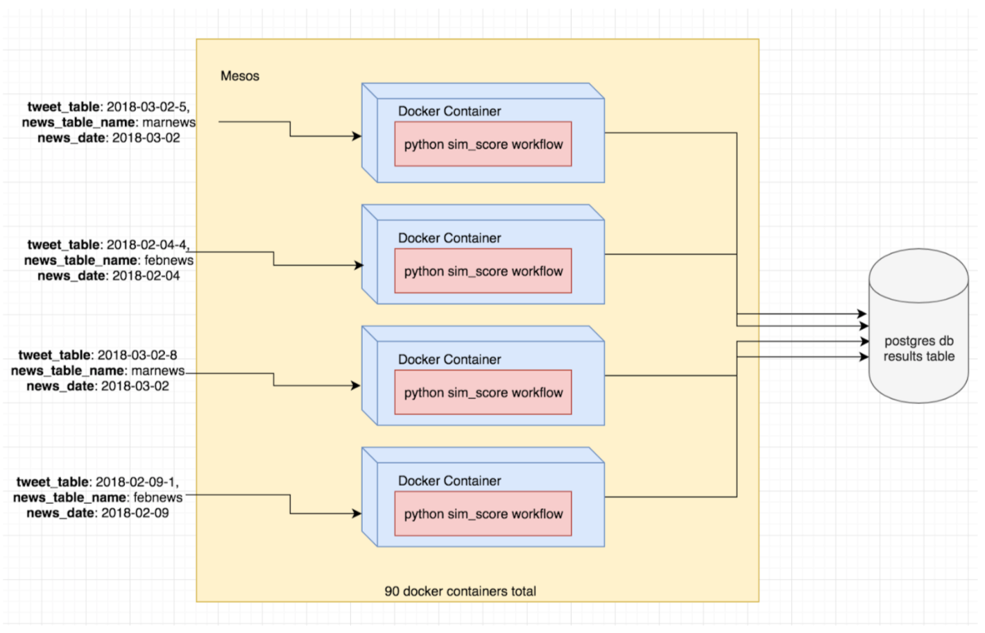Links tweets with news articles based on text content similarity using NLP techniques. Uses distributed computing (Mesos + Docker) to run the similarity score pipeline in parallel for speedup.